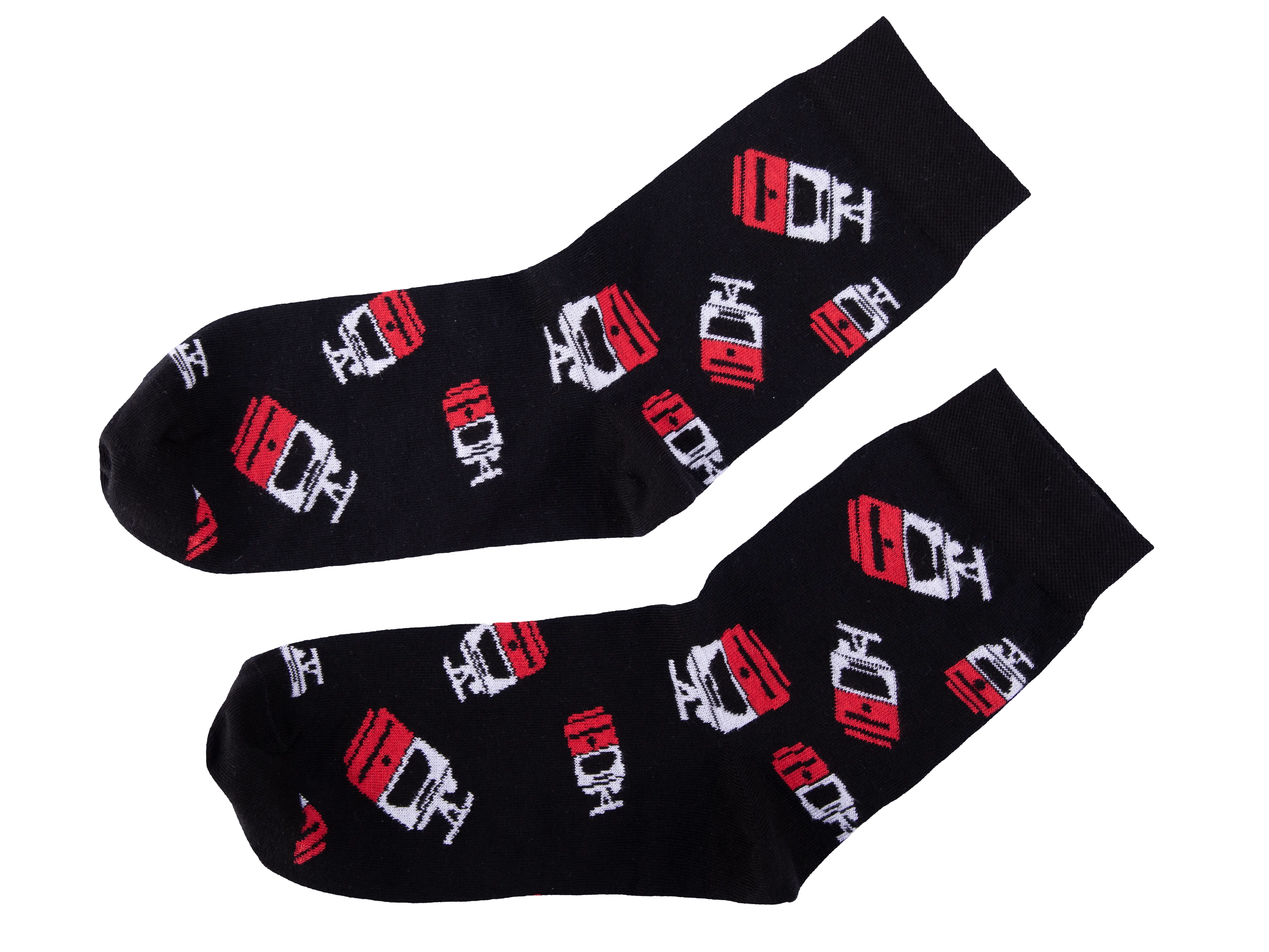 Die schwarz-roten Socken mit E1-Straßenbahnen peppen jedes Outfit auf. Neben dem auffälligen Design punkten die Socken auch mit angenehmen Tragekomfort und einer elastischen und gutsitzenden Passform. Die umfangreiche Größenauswahl macht sie zum stylischen Accessoires für Jung und Alt.