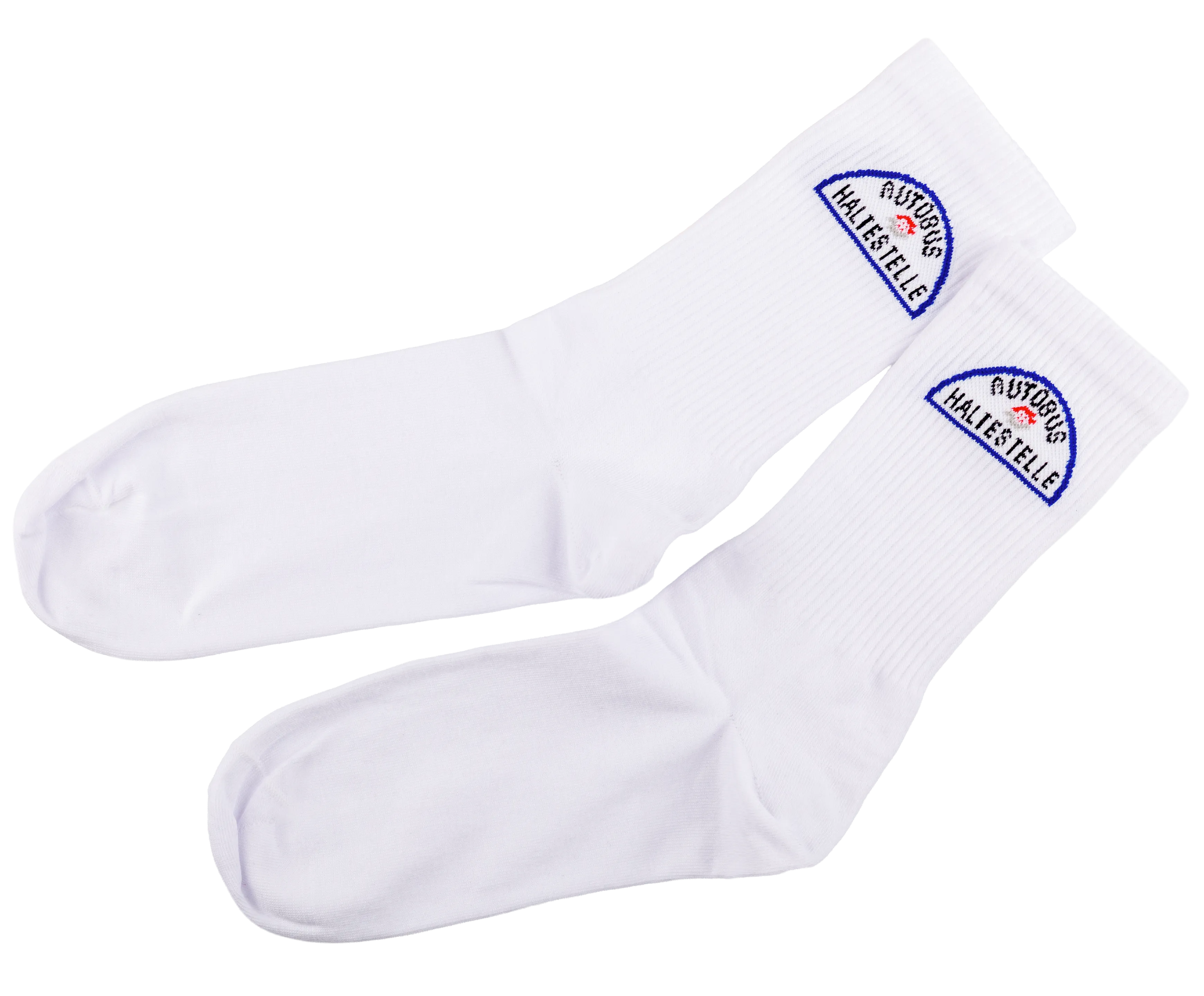 Die Sportsocken mit Bushaltestellen-Schild sind sowohl beim Training oder Laufen als auch ihm Alltag ein echter Hingucker. Die schlichte weiße Farbe in Kombination mit der kultigen Haltestelle verleiht jedem Outfit einen einzigartigen Wiedererkennungswert.