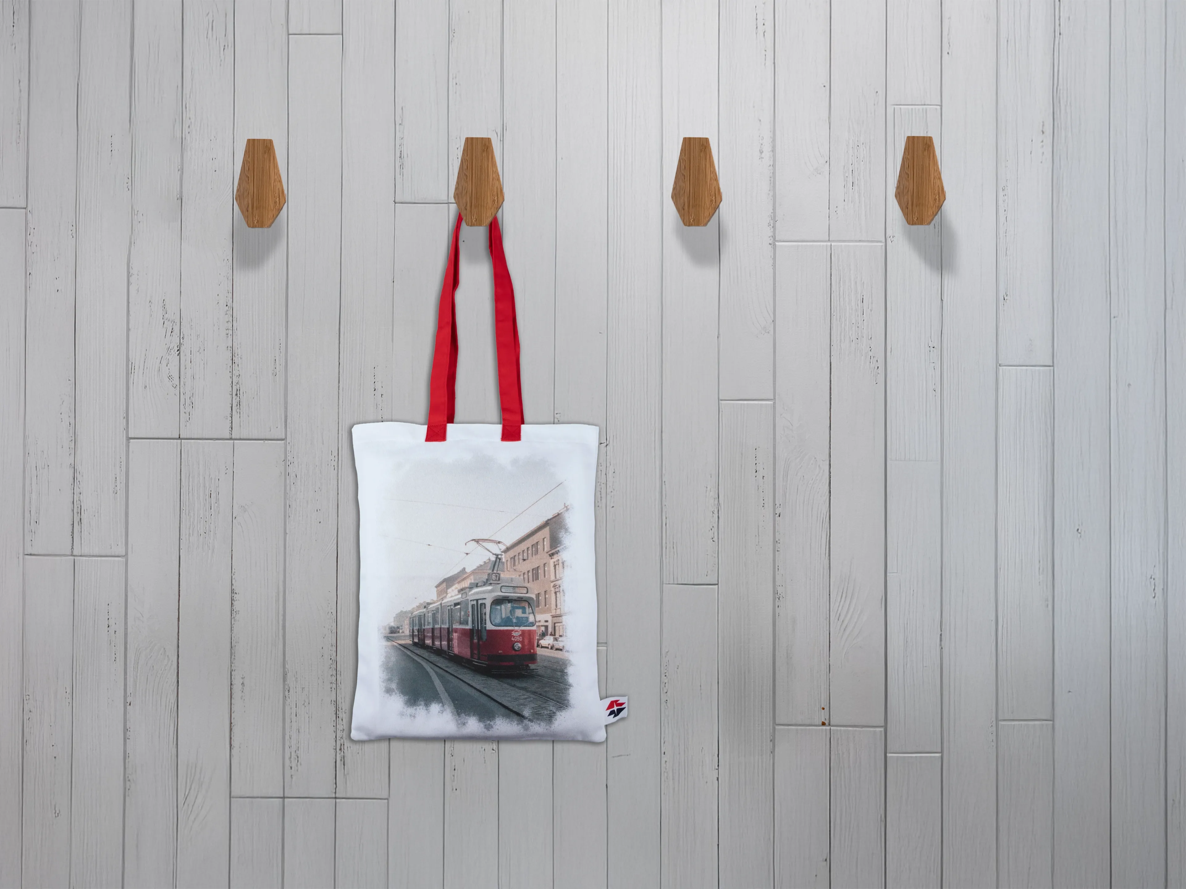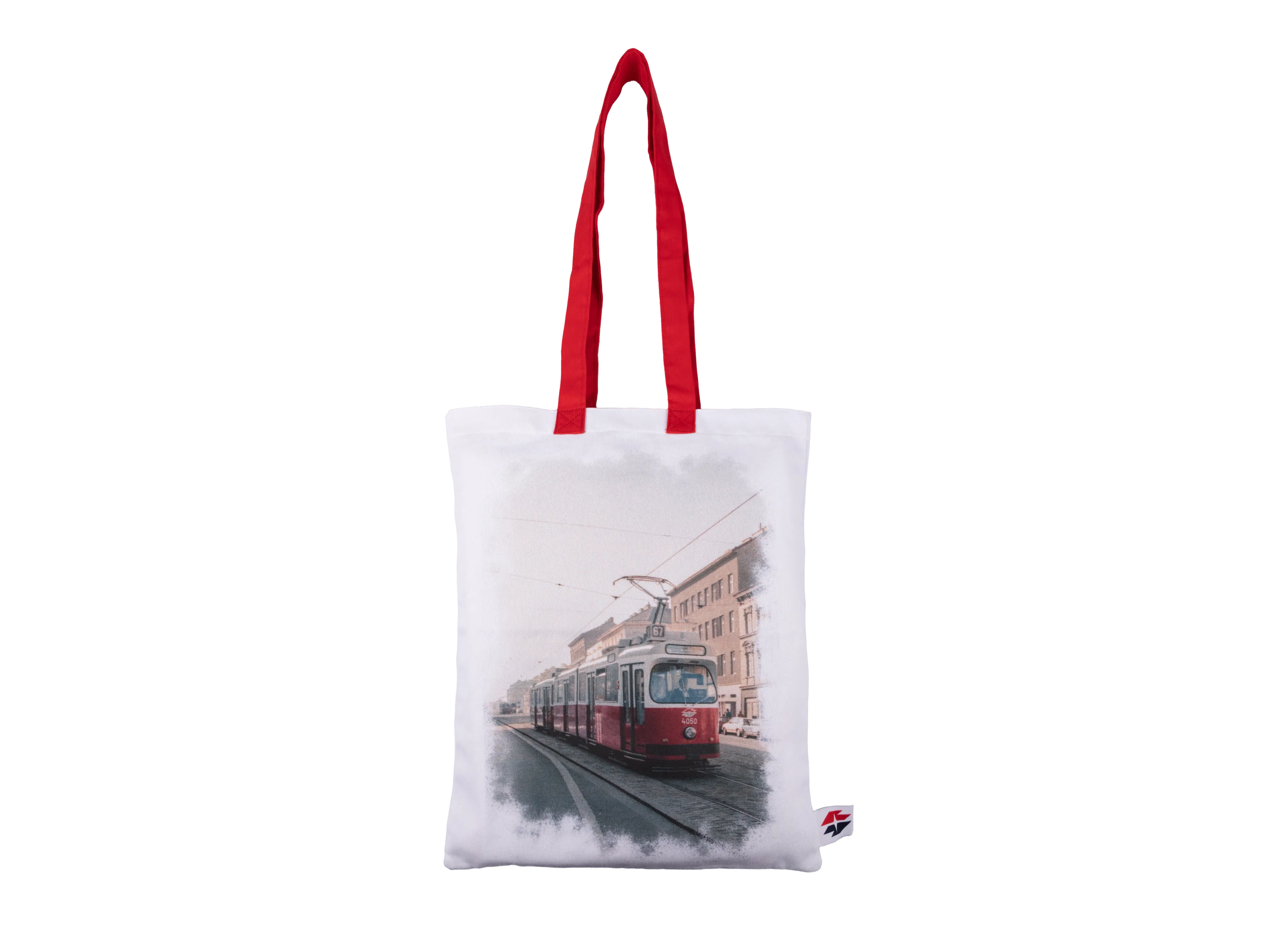 - Weiße Stofftasche mit E2-Straßenbahn-Motiv